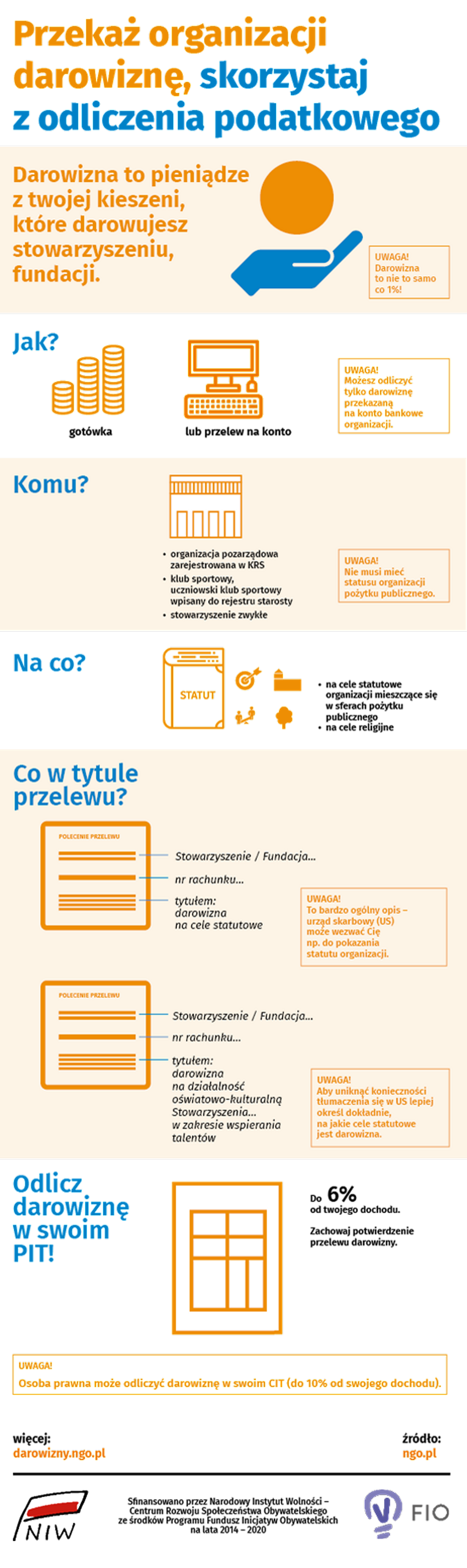 Co ważne – jeśli darowizna spełni warunki opisane w przepisach prawa, darczyńca może skorzystać z odliczenia podatkowego (do 6% od rocznego dochodu darczyńcy – osoby fizyczne, do 10% w przypadku osoby prawnej). Może to być istotna motywacja do przekazywania darowizn. Ważne, by cele zapisane w statucie organizacji mieściły się sferach pożytku publicznego (w praktyce chodzi o szeroko rozumiane cele społeczne, np. edukacyjne, kulturalne, charytatywne itd. - więcej na ten temat >) lub są to cele religijne.