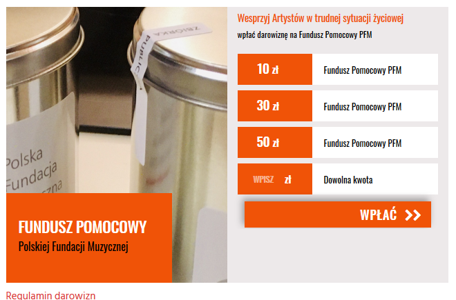 Polska Fundacja Muzyczna jeszcze przed wybuchem epidemii korzystała z usługi Wpłacam. Jednak, jak mówi Magdalena Turowska-Kowalczyk, zdarzało się to okazjonalnie: – Brakowało nam pomysłu, jak wykorzystać tę usługę skuteczniej. Natomiast teraz sytuacja zmieniła się diametralnie. Rozpoczęliśmy dużą akcję pomocową dla branży muzycznej w Polsce. Zamiast organizować drobne zbiórki na rzecz pojedynczych, ciężko chorych osób, postanowiliśmy pomóc całemu środowisku. Czyli zdecydowaliśmy się na zupełnie inną skalę przedsięwzięcia. I tu narzędzie, jakim jest Wpłacam, sprawdza się doskonale.
